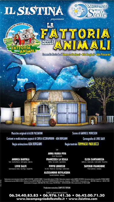ANNA MARIA PIVA - Zia Jo - Mucca Gisella ANGELA PASCUCCI - Stellina - Oca Isabella - Capra Belinda ANDREA BARTOLA - Tonio - Tacchino Narciso - Gallo Capitano VALENTINA ARENA - Gallina Isa - Anatra Isotta - Scrofa Camilla e Pecora Vera VINCENZO LEONE - Spaventapasseri Jimmy - Cane Pippo - Coniglio Miro - Gatto Zac CLAUDIO ZANELLI - Avv. Burri - Maiale Lino - Asino Biagio - Cavallo Toledo SAVERIO FRANGIONE - Primo Carabiniere - Animatore IRENE PISANI - Secondo Carabiniere - Animatore